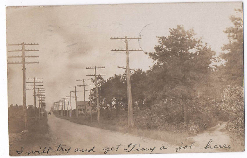 I'm sure there were plenty of interesting glass insulators along both pole lines that lined this unpaved dusty road as far as you can see in the distance in Pennsylvania. A shorter pole line with single-crossarm construction is seen on the right. It might have been for electric lighting customers. |