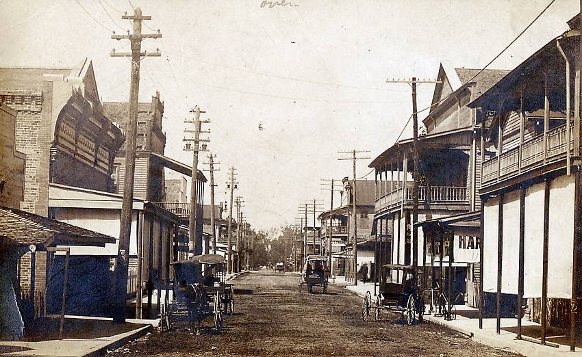 The latter pertains to the electric lighting circuits and lines you see along the left. There are several cast iron distribution transformers in view. These converted higher-voltage (typically 1,100 or 2,200 volts primary) as strung along the uppermost crossarms of these poles to 110 volts secondary for area electric customers. A then-recently new telephone openwire pole line with paired covered cable beneath is also seen, along the right. |