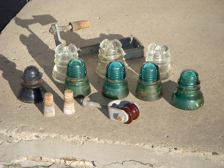 Still, this is one of those little interesting finds, that tends to make a day. A friend of mine was driving me to some errands, when we happened to pass the local Santa Fe tracks. There, in a large dirt area by the rails, I suddenly spotted a great pile of crossarms and cut poles, from a wrecked-out line, which still sparkled with glass. Instantly I shouted, "INSULATORS!" With that, we immediately pulled to a stop. If only I had had a camera with me. Unfortunately, it appeared that the "pickers" had already been at the pile. There were a lot of empty pins. But then, there was also a lot of broken glass on the ground. What remained, was all just common stuff---mostly Hemi 42's. But, I was still able to find a few pieces worth digging out of the pile. No unusual colors or embossings though (don't try to judge the colors, by the dirt and rust stains). Looks like I'll have to try that oxalic-acid bath, that everyone has been talking about. Included in my finds, were 3 aqua CD 145's (Hemingray 21), 3 clear CD 214's (Hemingray 43), a rather battered aqua CD 152 (Hemingray 40), a 1-1/2 inch spool with bracket, and a transposition bracket. I even grabbed a black plastic "REN" insulator, just for laughs. And, those wood cobs might come-in handy. There were also some porcelain power pieces, from the signal system's 4kv supply line. But, they were too badly broken, to be worth salvaging. I did spot a 6-inch Hewlett, complete with hardware. But, I had no tools with me, to remove it. So, I had to let it go. My lack of tools also forced me to leave a through-arm J-pin, which I really wanted to add to my hardware collection. All in all though, it was a great find, on a day when I wasn't even looking. |