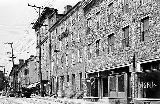 A single-circuit, three-phase sub-transmission circuit was strung atop this stretch of utility pole line in the forementioned Maryland community. These wires and their insulators were supported by extended or "alley arm" crossarm construction so that their high voltage was at a safe distance from the adjacent buildings. Beneath were lower-voltage distribution circuits for area customers. Towards the right is a short metal pole that appears to have perhaps supported DC trolley service cables. |