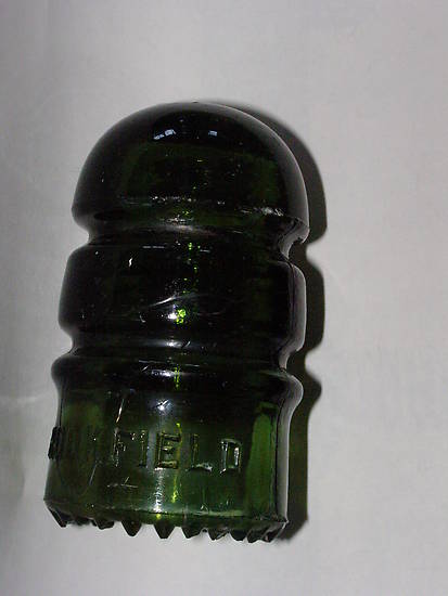 A lineman for the South Shore Interurban was selling his railroad stuff including insulators on January 31, 2015 in La Porte, IN. That was the same day as the Crown Point, IN swap meet for the Greater Chicago Insulator club and I ended up going to the auction. This was a nice colored insulator but had a long crack in it. |