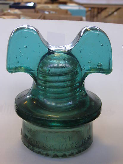 A lineman for the South Shore Interurban was selling his railroad stuff including insulators on January 31, 2015 in La Porte, IN. That was the same day as the Crown Point, IN swap meet for the Greater Chicago Insulator club and I ended up going to the auction. I thought I would go up to the full book value on this since it was mint and had a clear ghost embossing of "PATENT" but there were a lot of collectors in the crowd with no idea of the rarity of pieces so let it go when it passed beyond the top book value. |