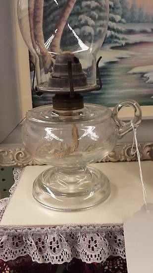 New lamp for me. have it in green. matches. nice pickup. plain dripcatcher bowl and base. Note the nice loopy handle. best way to ID these if you don't have patterns memorized.