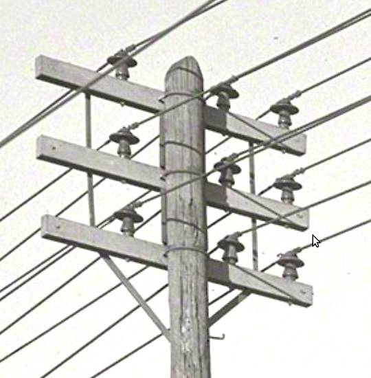 Michael W Spadafora M-2430's !! Note they are on porcelain pin bases ... Also note two different lower skirt sizes ... The narrow skirt specimens are clearly Victor products but the wider skirted ones could be other manufacturers or Fred Locke's . Also note the pole construction with the arms being banded to the pole rather then being held in place with a through bolt ... this is VERY old construction . Likely these were early Victor products with tan glazes is my guess... This is a close up from this 1936 Shorpy photo...http://www.shorpy.com/node/19233 |