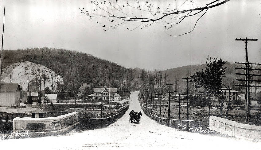 NY before 1920, showing 5-crossarm telephone lines and power wires on top using separate poles with transformer.