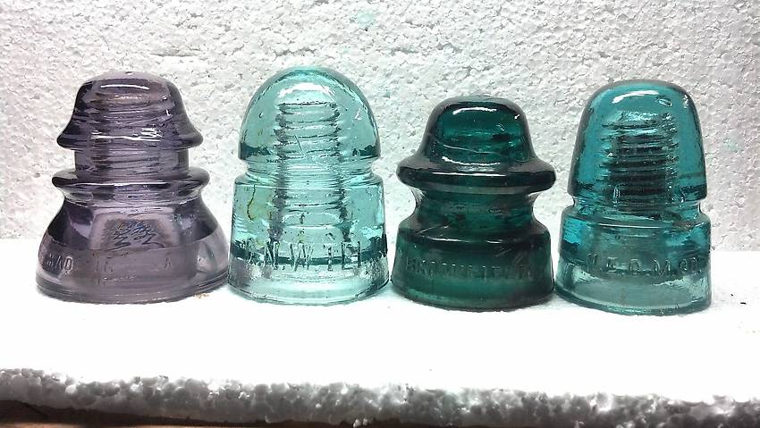 Found these today, the two on left found at antique mall having a 24% off sale ( WT #17 ) (G.N.W.TEL.CO ) with few streaks of amber great bubbles and debris !!! The two on the right (164 BROOKFIELD ) and (N.E.G.M.CO. ).