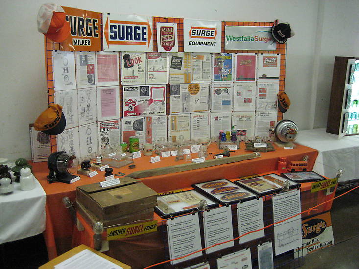 Russ furnished this picture of Marge and his display at the Springfield, OH show in November, 2007. Again, I'm posting this here so that interested folks can have access to a zoomable photo of Surge goodies. Look how many items they've added since March! Check out the cases of insulators. |
