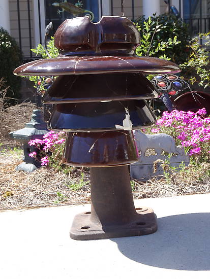 New Lexington, O marked M-4412 off the Chattanooga & Tennessee River Power Company's Hales Bar transmission line. The line was constructed in the 1909-1911 utilizing three-legged, Carnegie Steel towers. Each tower hosted two 44,000-volt, three-phase circuits with No.000 copper conductor and single static wire on top. The line was engineered with heavy, long-lasting construction and so this particular insulator design was chosen as a compliment to it. Two manufactures, R. Thomas, Sons & Co. and the New Lexington Porcelain Co. provided the line insulators and the Ohio Brass Co. the strain insulators (Remains undiscovered). Remains of iron tie wire clamps suggest that a heavy tie configuration was used. Evidently, every 5th tower had a storage building with additional M-4412 for fast repairs to retain reliable service. The line used pin-types until TVA re-insulated the towers using OB flange type suspensions in the 1920s. Shortly after, the line was replaced by TVA constructed lines set on a new ROW. Several New Lexington glazes and markings have been found: Speckle red/tan/brown, metallic dark brown, and metallic purple marked with NEW LEXINGTON, O, small JOHNS-MANVILLE, and large JOHNS-MANVILLE. Thomas glazes have been found in red, dark mahogany, and brown glazes with no THOMAS markings, only makers incluse. In theory, the insulators were removed and hammered for the wrought iron pin. The pin-types were removed and replaced by suspension strings in the 1920s. Confusion starts when tower paint has been found on pieces that were once together and not broken when the tower was painted. Either the tower was painted as the insulators were replaced but before they were hammered, or the pieces found with the tower paint on the piece once together were broken even more when the line was abandoned and conductor scrapped, or the insulators laid underneath the towers until the company hammered them for the war effort, or paint dripped from painting the crossarm above the insulator onto the top, we may never know. |