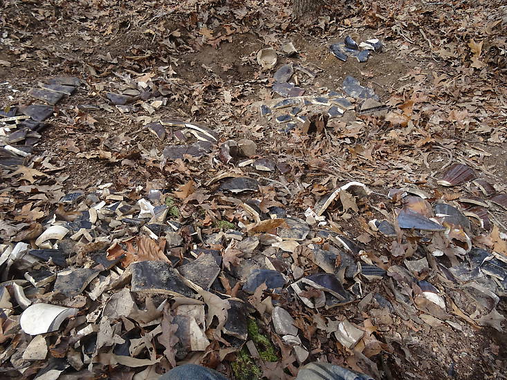This sea of porcelain is parts of six M-4412. One of which was a small marked Johns-Manville. To make matters more complicated we dug up the hill and discovered a storage shed where three additional insulators were smashed.