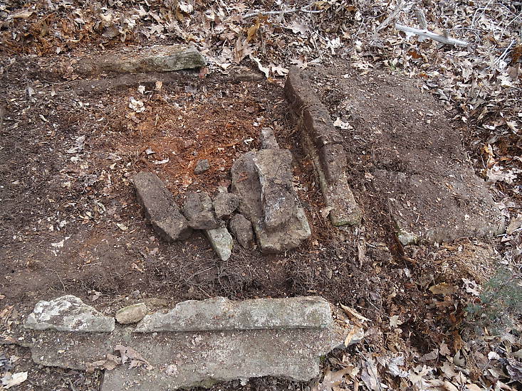 The storage sheds found about every 5th tower used limestone foundations. At this particular site I dug and cleared the ground in and around the small limestone pile and discovered the original buildings floor and existence of a door from an iron door hinge. |