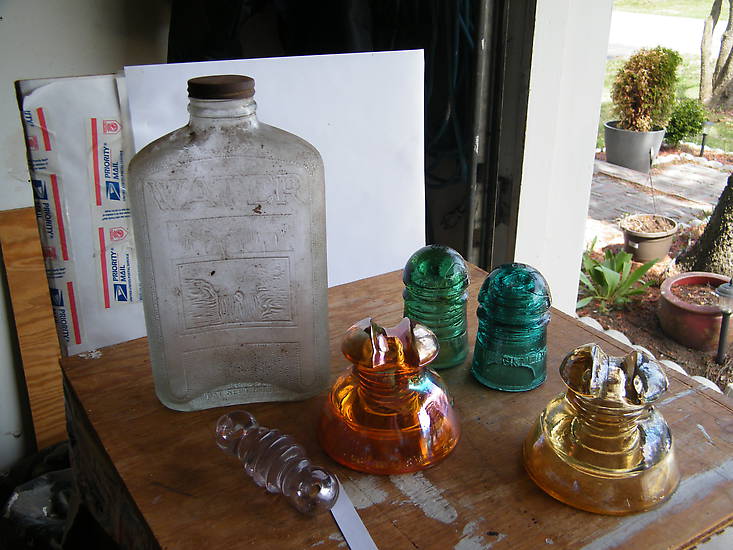 Lee Brewer send all thye registered Creb Heads a pic of a Brookfield made bottle he has in his collection. Didn't even know they existed until yesterday. Today I didn't fiind one that was Brookfield made but I did find the Hemingray bottle you see in my pic. Likewise, I would hae know these existed if not for guys like Bob Barry or Pat Scott postng pics for others to see here at Icon. Mine was found at my Catskill Mountain flea market from one vendor, The two Pyrex CD 234's in carnival came through another vendor who has been setting up for years but never has any insulators. The radio strain insulator came from a antique store. It is purple tint, maybe light purple in color with no embossing. I visit that antique store a couple times a year and it has been actually been years since I made any purchase. The two ponies came from an antique store that will have been where it is for one year. Was my first stop there since I don't pass through that village all that often. While there the owner told me where there was another store that also hasn't been there all that long. It was close to where I live so stopped in. That antique store used to be a deli where me and my buddies would visit often near 40 years ago. It was one of our many beer stops. |