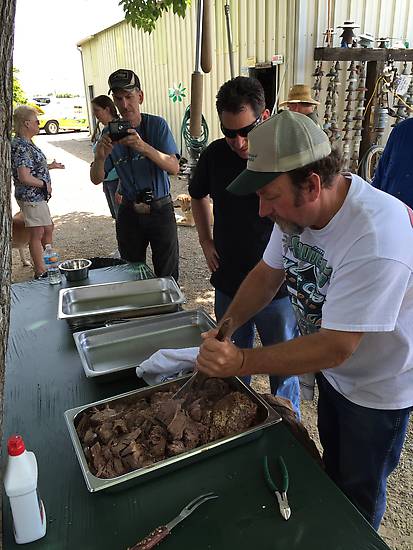 Bill is pictured here pulling apart one of the tender pork roasts that slow cooked all night, buried underground with hot coals. This feast has been a Rohde tradition for years.