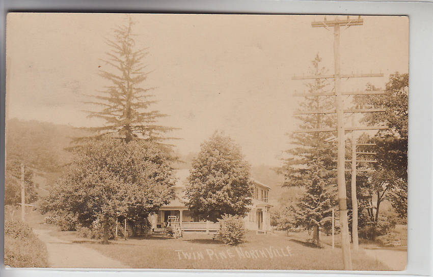 Good looking rural setting through the pine trees with electric service lines atop this pole line strung along 4-pin crossarms.