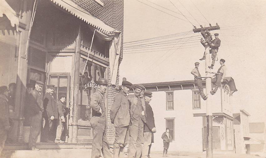 Main Street, Downtown USA c.1915, Electric Utility Linemen on Pole