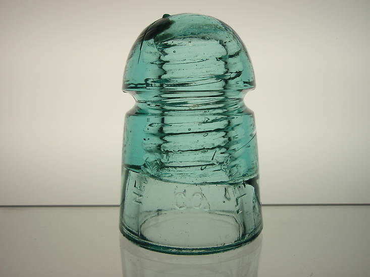 Upper wire ridge is sharper than any other NEW ENG. 104 pieces I own of differing EIN's but not as sharp as other Hemingray 104 pieces. The ampersand looks correct as does the dome artifact [id=434420520]. Here is a shot of the dome rock [id=434375749]. Color is light blue aqua I believe. This piece [id=434375385] was dug 3 poles up the line. Note how the upper wire ridge is sharper and ampersand more elongated than those with the dome artifact. |