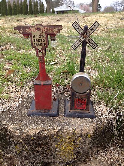 Here are a couple of nice little tin railroad crossing signs for model railroading. Not sure what gauge they are for. The red one is double sided and both are approx 7 1/2" tall and 2 3/4" across the base. Paint is faded on both but still looks pretty decent considering the age. Both have electrical connections on the rear but I am unsure if they work. Asking $25.00 for the pair plus shipping. Payment by check, money order or PayPal the non fee way. |