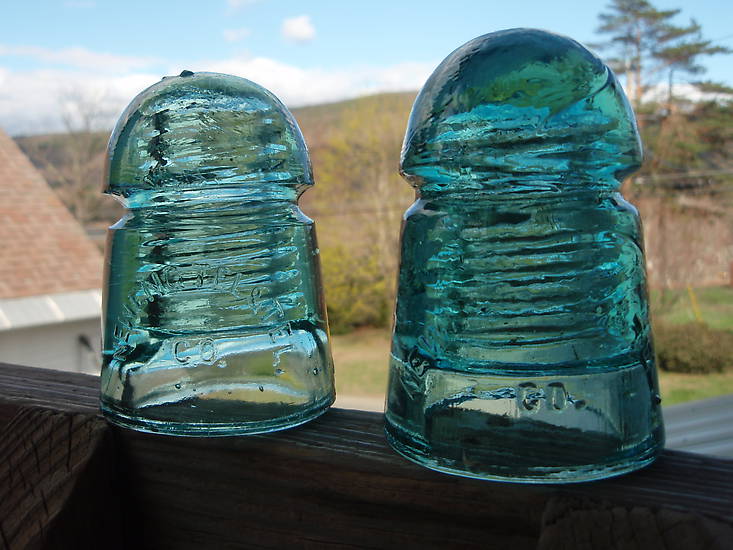 Hemingray made New Eng. 104 on the left in a light blue aqua-ish color with dome artifact. Some thin vertical slicing here and there extending from the upper wire ridge onto the crown a bit. Squatty piece that slumps to the left. On the right is a tall dome #4 in blue which looks more like a dome #7. These two were lying right next to each other and I saw them glistening under the leaves as I was probing. Approximately 12 or so poles away from where the other Hemi 104's were dug |