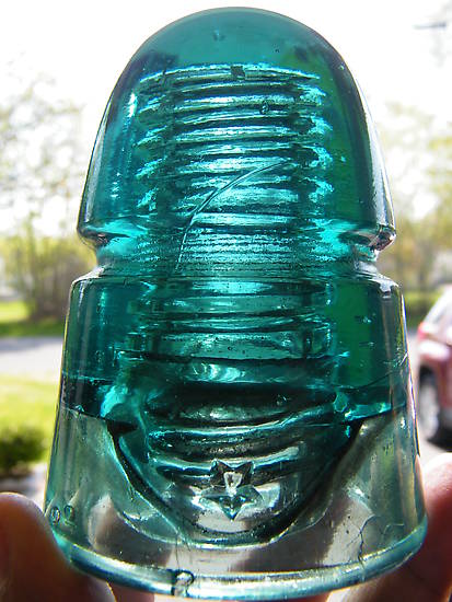 In this pic you can see there are three threads behind the Star that are not supposed to be located there. I'm not exactly sure why they are there. My guess there was a rush order and or whoever made the insulator was in a hurry to remove the mandril. In my next pic you will see that the inner skirt was pushed right up against to inside of the outer. |