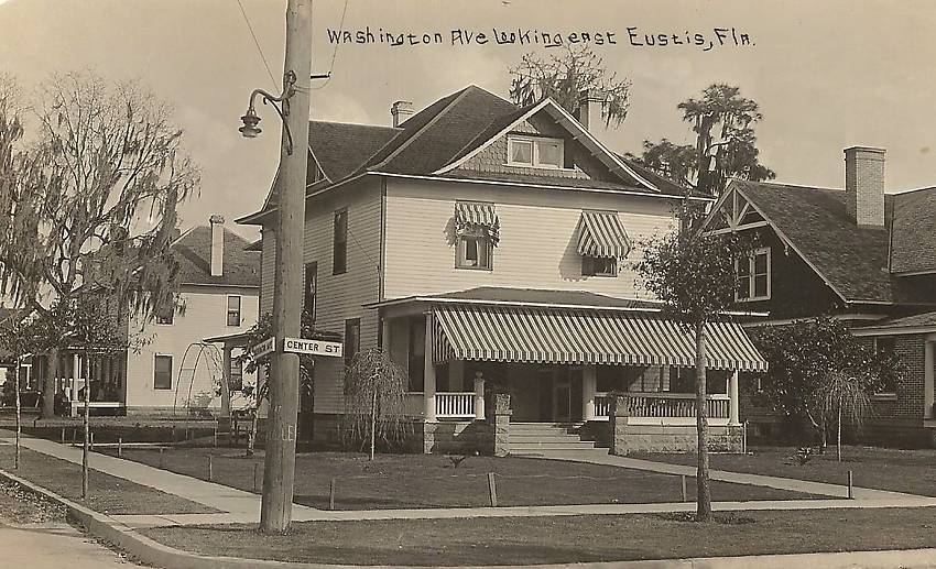 Typically a lot of fixtures like this one had a "radial wave" or "ruffled" reflector (or shade) upon them. This is a somewhat unusual instance of a street lamp utilizing an open-bottomed glass refractor for the lightbulb's optics. I believe its principle/purpose was so that the light would be distributed evenly around this corner/intersection with a minimum of unwanted light trespass into adjacent windows. This porcelain-bodied fixture was mounted upon a neat double-bend, ornate bracket with a wrought-iron scroll undersupport. |