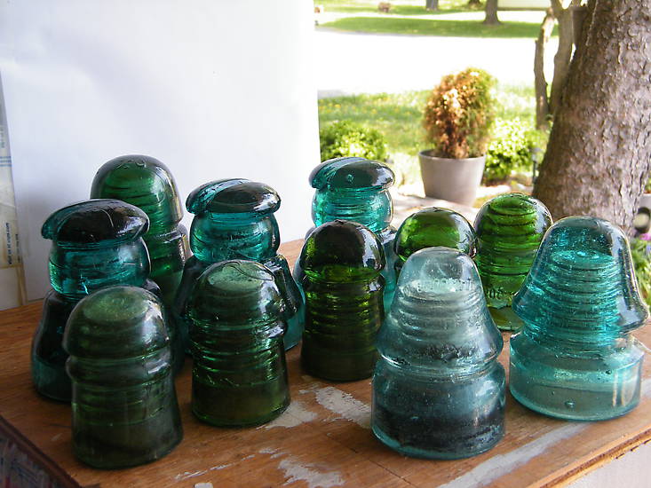 These came from a Craiglist seller who had pics of a zillion teapots but none of insulators even though the ad said they had a bunch of them. I requested pics a and when I arrived one of the most interesting insulators that I saw in the pics couldn't be foundl. It looked looked like it was a Brookfield CD 127 in light green. During our email communcatuons the woman told me she and her sibling really didn't know what they were worth so she hoped I would do the family right being they were gathered by their father who passed away about a year ago. Was also told that her sister was doing some research on them so nobody could just come along and try to take adantage. I had told her most of what I saw were extremely common but she may have a few that were worth quite a bit more. I was told that someone had seen them and presured them to sell so they were already leary of so called collectors. Normally I don't bring my price guide along with me when I go out hunting insulators but I thought it would be best if I did this one time. They were very happy I did after I looked up insulator after insulator for them and also let them loo for themselves. I'm still some disappointed that 127 was nowhere to be found. But if it does show up I've no doubt I will be getting a phone call. I'll be uploading another pic with these insulator spread out in case anyone get ID them from this view. The color is washed out in that pic and that is why I uploaded this one here. Besides that, I left a piece of mud out the guy just gave me being he didn't have enough change for y twenty. |