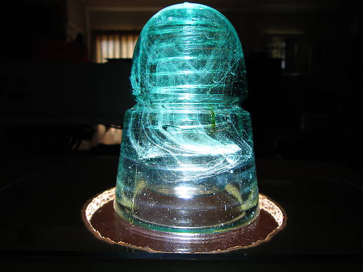 My brother and I were hunting the rail line that leads to Laredo, TX back in the early 1990's and picked this Hemingray product from an abandoned pole. Lots of swirly, fizzies throughout. Even a small amber streak. The dome is embossed with the letter "H". Insulator has a bar in the front and a bar in the back. Bar in the front and a bar in the back...gee, I wonder if they serve munchies? Catchy name.....The Insulator Bar. |