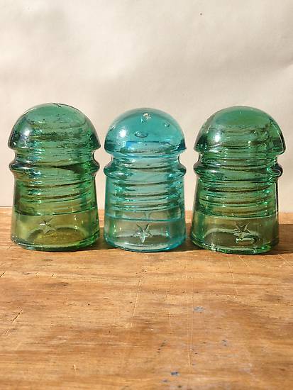The insulator pictured in the center is light blue aqua. Has Star on both front and rear skirts. Not in perfect shape but displays best as shown. There is a skirt crack on opposite side. The two insulators bookending that one are light green in color. Both have different sized Stars on their frint sides. No stats on the rear skirts. Both do have some nice ambering going ons in their skirts. Niether are mint condition but close. $17.50 East of Mississippi and $20 west of there on these. Pay Pal non-fee (friends & family) as well as checks excepted as payment. First email as always. Now at my take a loss after shipping price of $15 shipped. |
