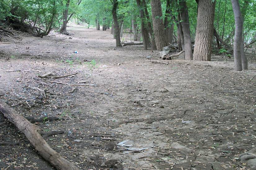 A large mud flat left by the receding waters is seen once inside the foliage perimeter. Unfortunately, this is not where the shards are. This is looking west. The river is well within its banks to the right.
