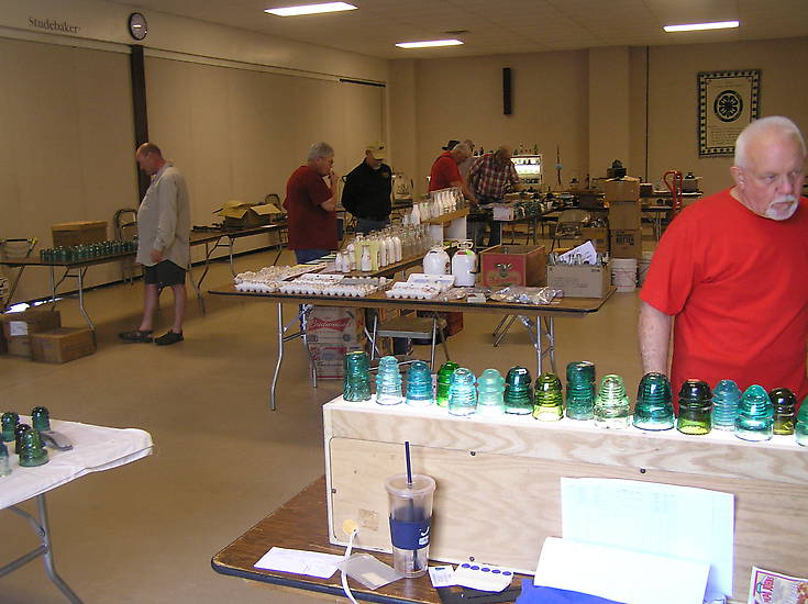 Although the numbers of dealers were down this year, walk-in traffic was pretty good on Friday afternoon. Here we have Jamie Houdeshell on the left turning his back on Indiana Milk Bottle master John Cleland in favor of the effluent tsunami of Hemingray 9's overflowing the Borg's table. In the far background, veteran of the 1st NIA National Dave Ramp risks his Boy Scout Leader reputation by publicly speaking to Jack the Snyder. On the right is art supply baron Rick Jones trying to sidestep the camera. |