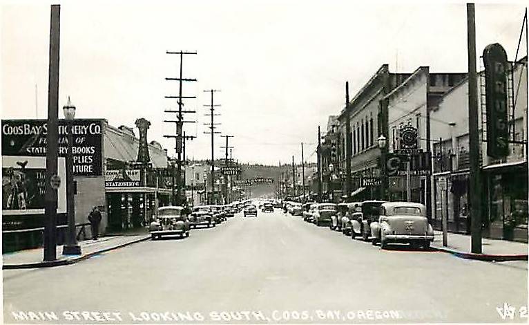 Multiple crossarms upon the pole line along the left likely were for various circuits and distribution voltages that served this Oregon comminity.