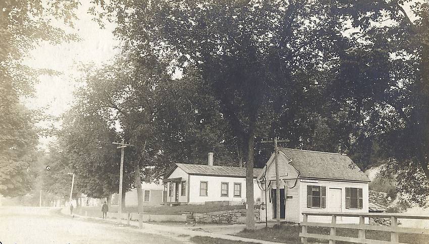 It is difficult to determine if this open wire route was for electric lighting or telephone service since both sometimes were similarly constructed around the turn-of-the-century. It appears the local village post office stood within the small cottage on the right with a shorter pole in front of it. |
