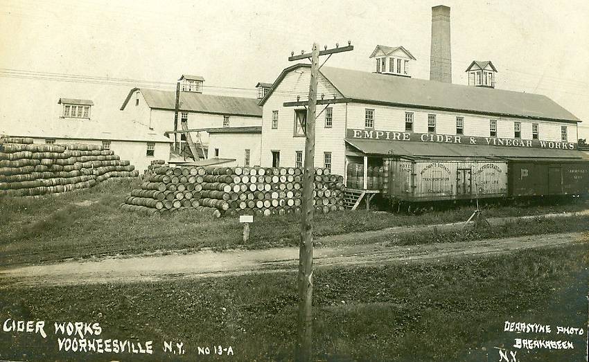 Voorheesville, NY c.1915, Cider Factory, Early Double Crossarm RR Telegraph Pole