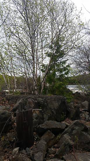 Just wanted to shown some of the terrain the wife and I went through. This is a pole sight right before the big river span. Not many pieces to be found here. All the pole were taken somewhere when the line was dismantled. I had a hunch that they were thrown in the thick tree line that ran along side of the rocky hills. I will check next time to see if they are there. |