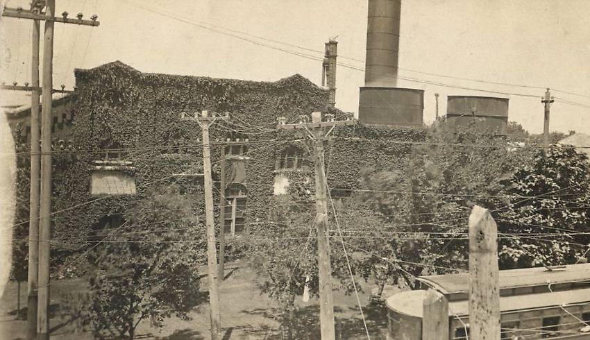 Not sure exactly where nor what kinds of insulators were used, etc. Check out all of that ivy siding on the brick building ;-) This is a file photo (along with the vintage photo submissions before and after this one) and we are not certain of the image source. Any info regarding this one and the other two pictures would be appreciated (will update the text as well). |