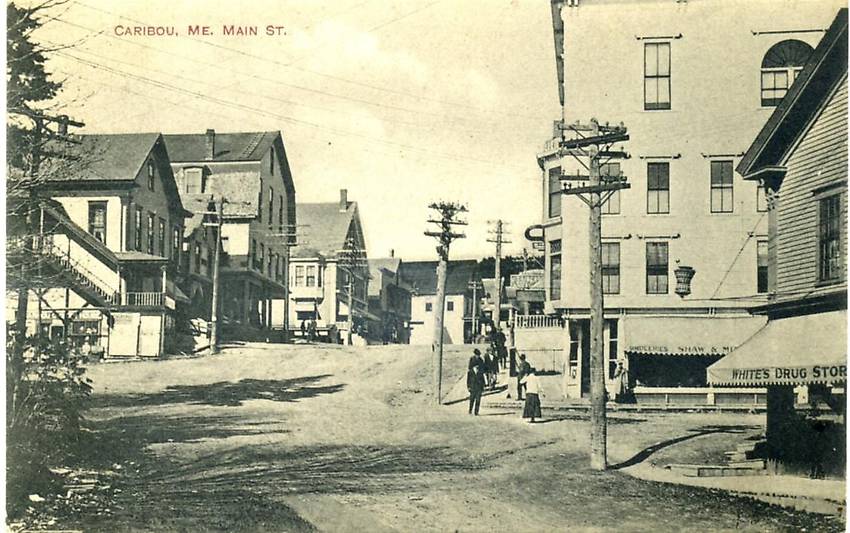 The latter are seen strung on the right with telephone openwire circuits along the left in this northern Maine community's business centre.