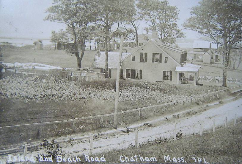 Although the sidepins are maybe hard to see here, they are evident on the pole in the centre of this image. The Southern Massachusetts Telephone Company operated in Chatham as well as within most other Cape Cod communities (not sure until when New England Telephone took over in Chatham but maybe by the teens). An old Cape Cod style post-and-beam house (similar to what I own) likely built in the 1700s is visible in this pastoral and peaceful view of upper Cape Cod. A garden of vegetables and/or fregrant sea roses graces the fields nearby... |