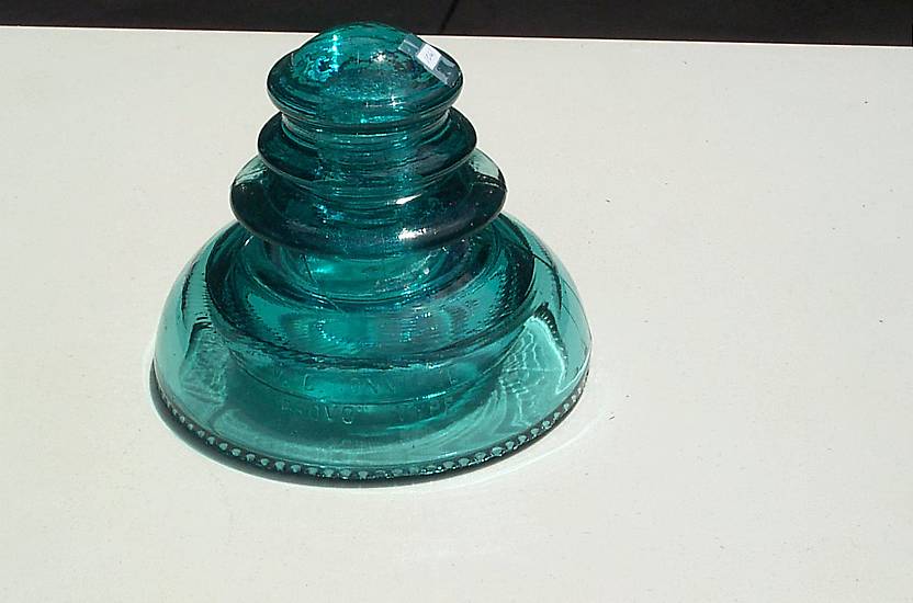 This insulator has a shallow chip on the base that removes two drip points and another drip point is missing on the opposite side. The insulator has both shape drip and round drip points. Embossing is weak but legible. I see no damage on the top of the insulator. I'm asking $40.00 plus shipping. I think it will require a flat rate priority postal box costing $12.65. |