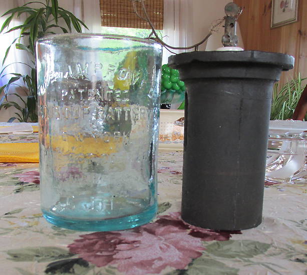 Hello all......traded for this with a bottle collecting friend of mine, he found it in an attic while helping with a house clean out. He told me it was still full of acid when he got it. Can't seem to find any info on it. There is no pouring spout on this and it is heavy and thick. It is embossed: THE IMPROVED (in an arc)/ PATENTED/ POROUS CUP BATTERY CO./ NEW YORK/ PAT'D OCT 26 1886/ TRADE MARK/ C.J.H. (four stars around CJH) Any feedback would be appreciated. Thanks for looking. |