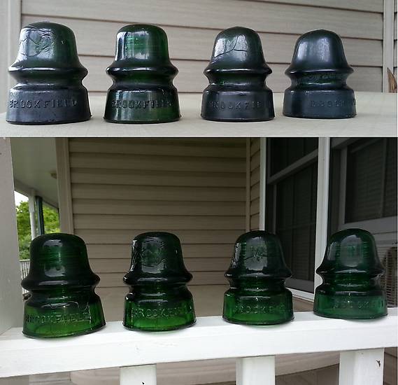 Found these at some antique stores in West Virginia last weekend (top row is uncleaned, bottom is the same pieces cleaned). Unfortunately my cell phone camera does not reproduce colors well, and it distorts the image on the ends. The two 162.1s are more of an olive green, and you can see little swirls of amber in the skirts. The 162 on the right is a good dark green. The other one, which I think is also a 162 (but maybe a different .x? I'm not a signal specialist) is a good yellow green. |