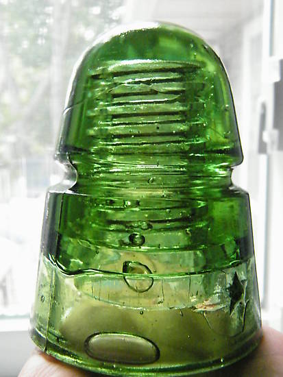 This Star beehive is a glowing yellow green from top to bottom. Just the way from what I hear the old time collectors wanted them. They didn't want amber swirls and they may have even rejected buying this one with the large noticable bubble on the left front side of skiirt near the base, That bubble is at least 1" long by 3/8". Straight above that bubble on the innerskirt there is another 1/2" bubble. You can see both of those from the same viiew. You will find many, many more smaller bubbles throughout the piece. A few of those are the chain bubble type. The condition is mint minus a little wear in the wire groove so you can tell t was used. I also count three spots that have excess glass sticking up above the surface. One of those is obviously a tool mark where there is excess glass as well as a depression in same spot. That would be straight up above the Star near the top of dome. [id=437382359] to return to package deal page. Asking $45 shipped anywhere in the lower 48 US States. I accept Pay Pal non-fee as well as checks. First email saying I want gets. Thanks for looking! How about $40 shipped to your door? |