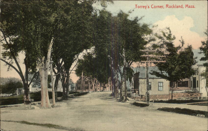 This community is about 20 miles southeast of Boston and for many years was served by the Southern Massachusetts Telephone Company. The three-crossarm line in the foreground on the right is believed to be a Ma Bell toll lead that connected the Rockland central office with Scituate, MA about 10 miles to the east. On the left were electric lighting circuits owned by the Electric Light and Power Company of Abington and Rockland. An old incandescent gooseneck-style street light that once illuminated this intersection is also seen. Soon after WW2 ended the forementioned electric utility was purchased by the Brockton Edison Company. |