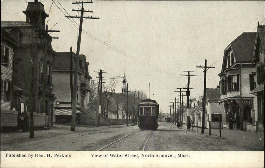 North Andover is about 40 miles northwest of Boston, MA and not far from where Samuel Oakman had insulators produced for him at Lyndeboro, NH; Haverhill, MA and possibly other nearby locations prior to 1900. No doubt some of his insulators were either in this view or lots of them used elsewhere in this Massachusetts community for comms, fire alarm and electric lighting circuits. |