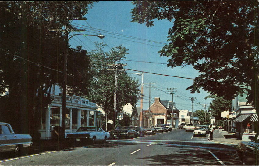 Outfitted with early-to-mid 1960s General Electric mercury vapor street lights, this upper Cape community's downtown was lined with neat 1960s cars and other street scene nostalgia; illuminated by the forementioned luminaires. Electric service was provided by the Cape and Vineyard Electric Company (now NStar Electric). |