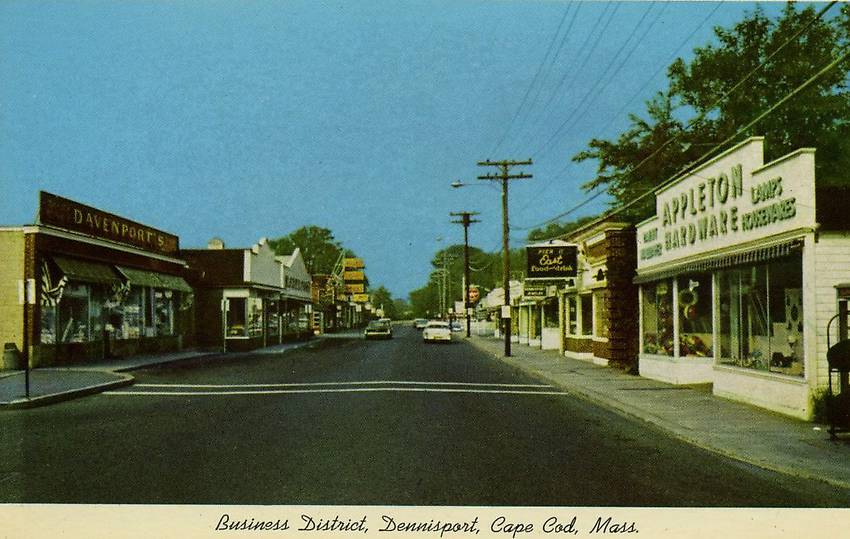 Like most other communities at the time this town (actually known as Dennis) was served by the Cape and Vineyard Electric Company. They utilized a lot of neat construction in their day (until purchased by the Commonwealth Electric Company in the 1970s). And I have LOTS of fond memories of what stood as we went to local beaches in the vicinity in the 1960s ;-) Old examples include three-spool crossarm secondary drop brackets made by Hubbard, steel pins that were tightly hammered into their crossarms without the use of bolts (thus "threadless bottomed pins"; small Pyrex distribution insulators (notably the CD 233, 234 and 235), a wide scattering of Ohio Brass porcelain "hat" insulators, etc. Some of this old stuff remains where the existing utility (NStar Electric) has kept distribution at 4kv primary.. which is not a real lot. It is really neat seeing what remains of this old pole line architecture on Cape Cod and Martha's Vineyard despite the many bad coastal storms and hurricanes these pole lines survived and endured, still standing, since they were built in the 1940s and earlier. The mercury vapor street lights seen were made by GE and installed not long before this picture was taken. Can't you just hear the very popular radio hits from convertibles driving by with 1963 hits such as Martha Reeve and The Vandellas: "Heatwave" and "Quicksand" (released shortly afterward, in November 1963) ... ;-) |