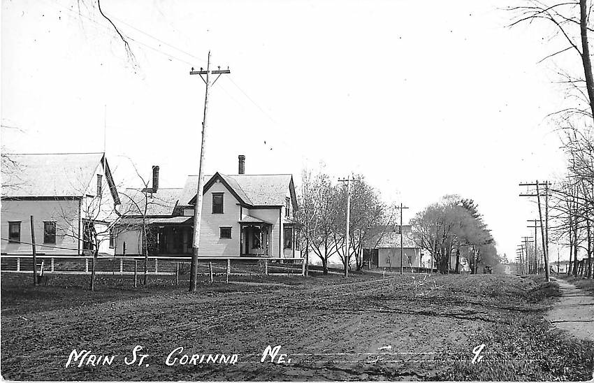 Most likely open wire for local lighting service customers existed along the left of this stretch of unpaved roadway in this small Maine village. Along the right is what probably were telephone subscriber lines. Given the somewhat primitive and "non-standard" appearance of the latter construction I can rather safely say these were owned and operated by a small independent ("Ma and Pa") phone company rather than New England Telephone and Telegraph Company. |