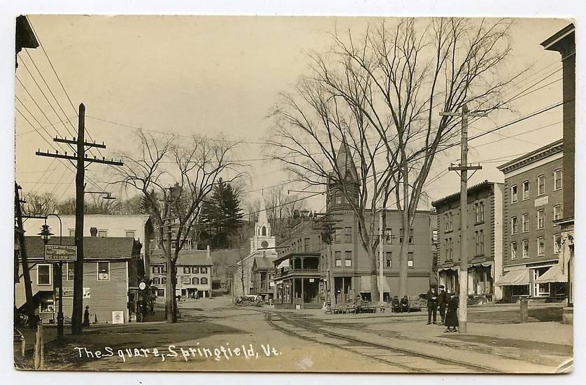 Telephone openwire with some electric lighting service wires existed along the left and probably upon the "busier" poles in the background within this Vermont business district a century ago. Trolley service was provided by the short-crossarm line seen along the right supporting two rather heavy direct current copper cables. |