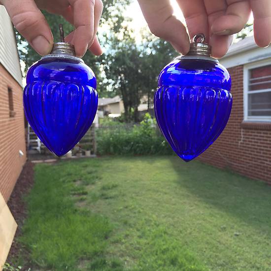 These are the first lightning rod pendants I've ever seen in person. They are much bigger than I had expected. I've been informed these are GOOD ONES! They have no missing glass but a few fisheye dings, and the chrome isn't perfect on the caps, but hey that proves they're used! I'm looking for more pics of them in use. They are for sale message me if you're interested. Enjoy! |