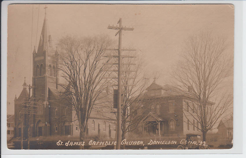 Electric lighting service circuits were upon the top of this crossover pole with a six-pin, 10-crossarm telephone lead beneath. It is very possible the latter was along the same route as seen in the previous photo illustrating a five-crossarm pole line in this Connecticut town. |