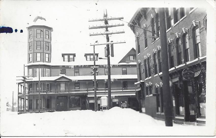 Mostly telephone openwire in this image with a couple shorter crossarms upon the pole in the centre background that looks like it supported a small electric lighting distribution transformer.