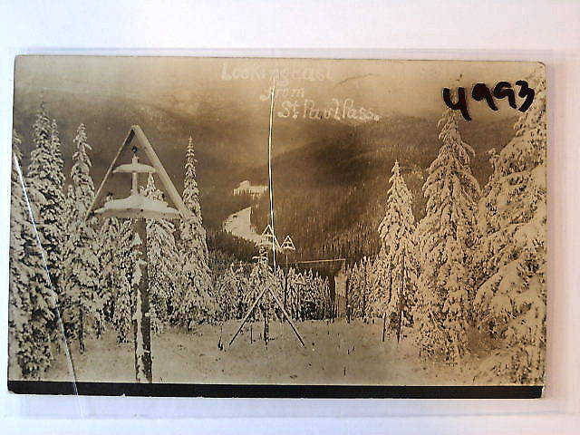 I have no idea exactly where this was (maybe in the Pacific Northwest?) nor what kind of insulators were once used. In addition the triangular construction atop these poles intrigues me and I haven't any concept of its purpose. Any additional information would be appreciated and I will update this page with further info. |