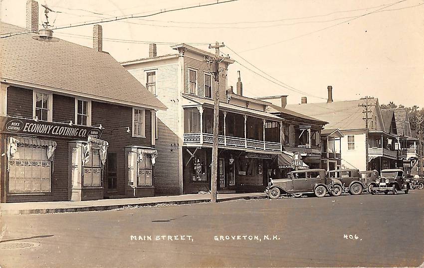 Note the openwire service wiring down alongside customers' buildings, particularly the one in the centre of this image... In addition some rather early and primtive electric lighting service pole line architecture and equipment is seen that served customers in this New Hampshire town. A spanwire street light is visible on the far left that illuminated this intersection with four incandescent lightbulbs on the underside of it. |